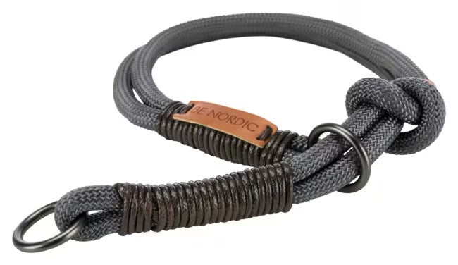 Rundvevd dressurhalsbånd i tau med enkel og trinnløs justering via knute og metallring som trekksperre. Halsbåndet kombinerer funksjon, komfort og kontroll – perfekt til tur og trening.