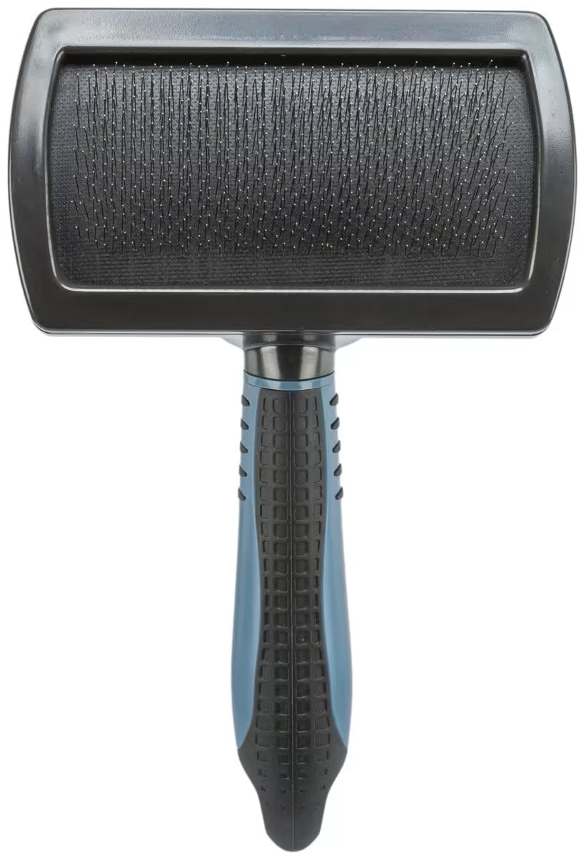 Trixie metallbørste med myke metallbust er ideell for grundig, men skånsom pelspleie hos hunder og katter med både dekkhår og underull. De fleksible metallbustene løsner effektivt floker og fjerner løse hår, samtidig som de masserer huden og stimulerer blodsirkulasjonen.