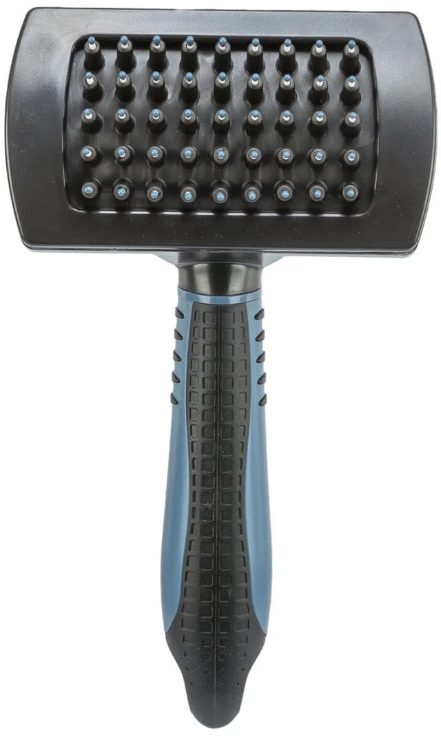 Det ergonomiske plastikkhåndtaket med gummiinlegg gir godt grep og kontroll under stell. Børsten er skånsom mot huden og passer også godt til sensitive dyr.
